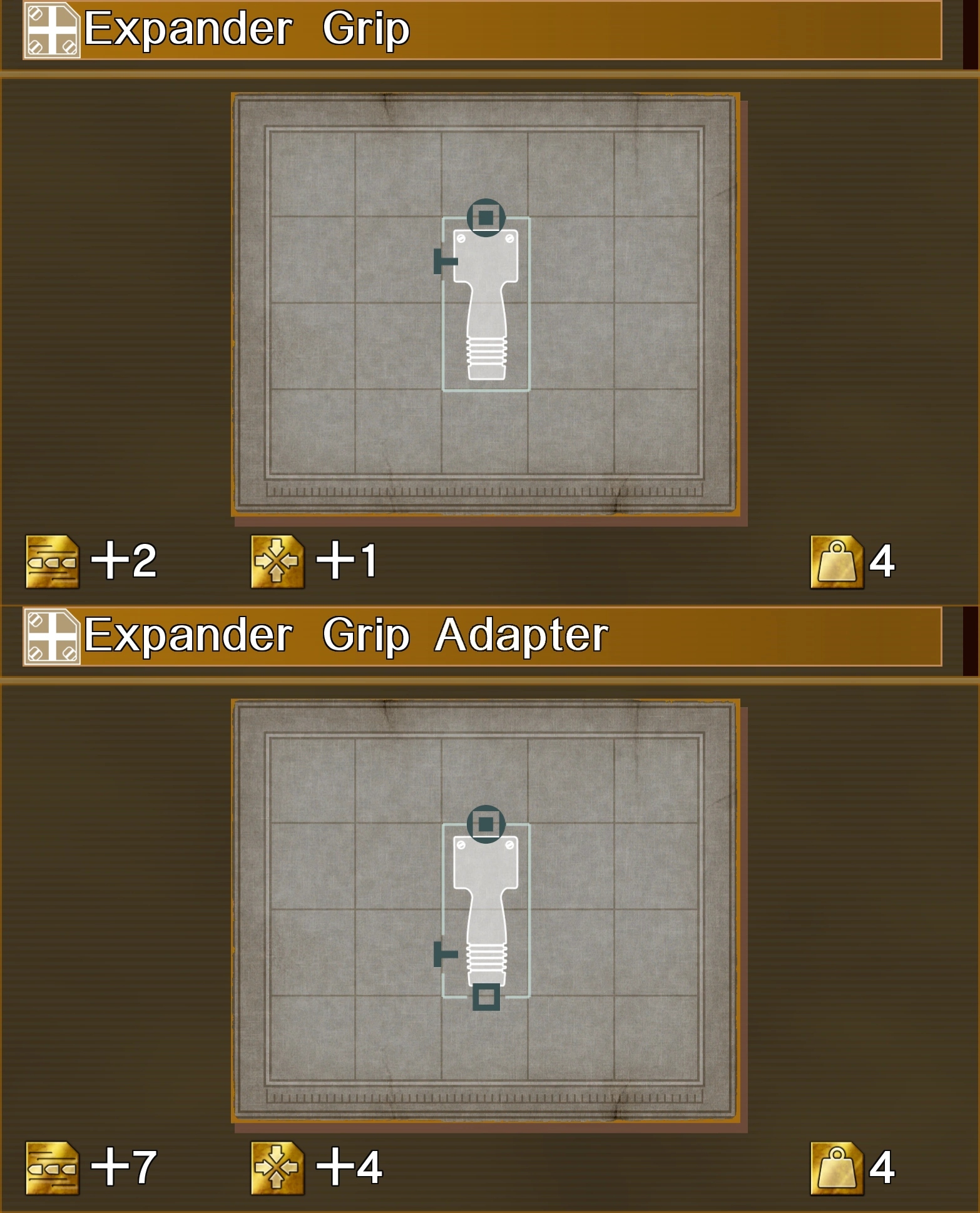 In the english version of the game, there are two Custom Parts called "Expander Grip". The grip with the Expander Sub-Barrel slot on it's lower half and another grip slot at it's bottom is supposed to be called Expander Grip Adapter and will be referred to as such on this wiki.
